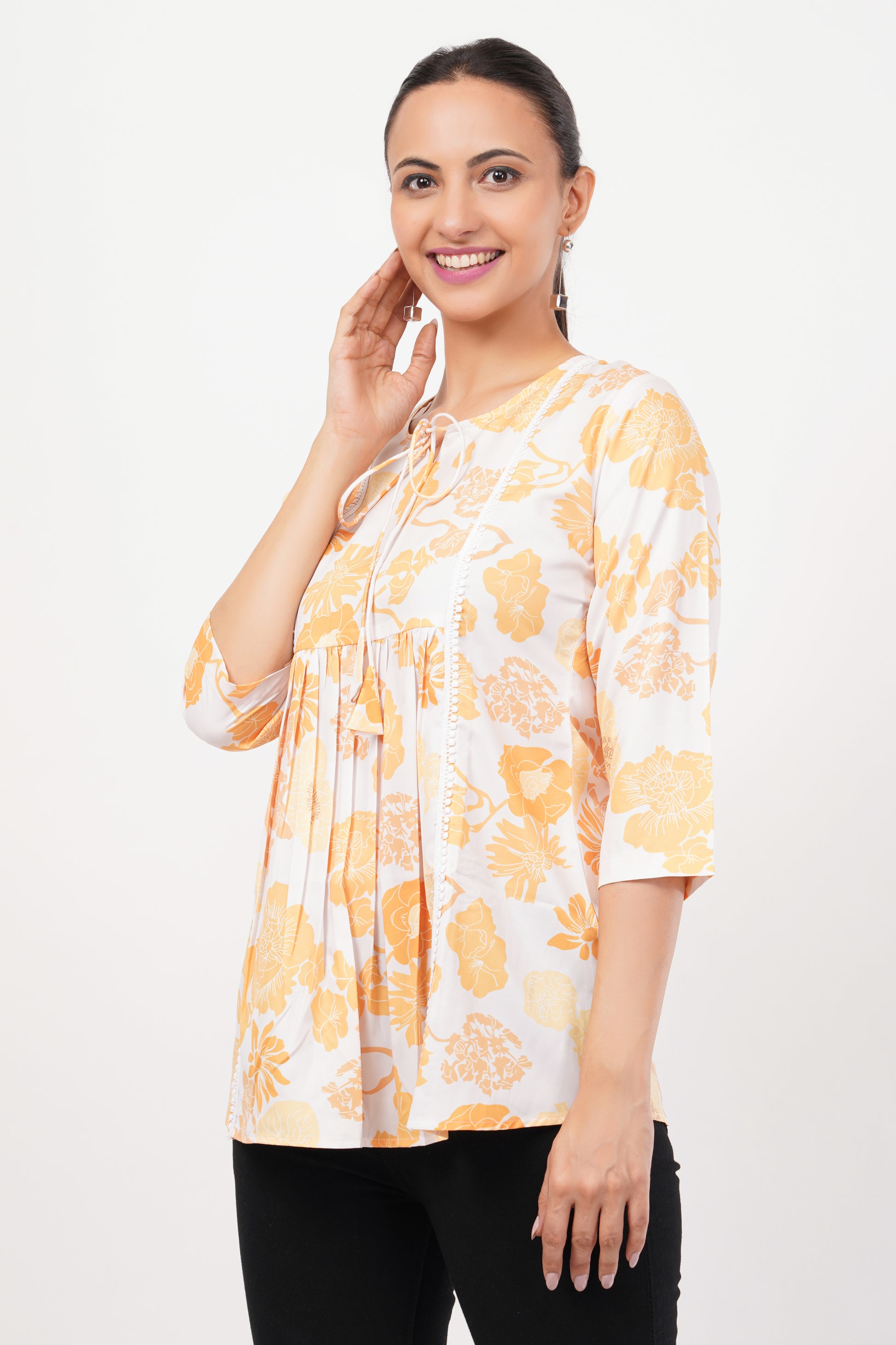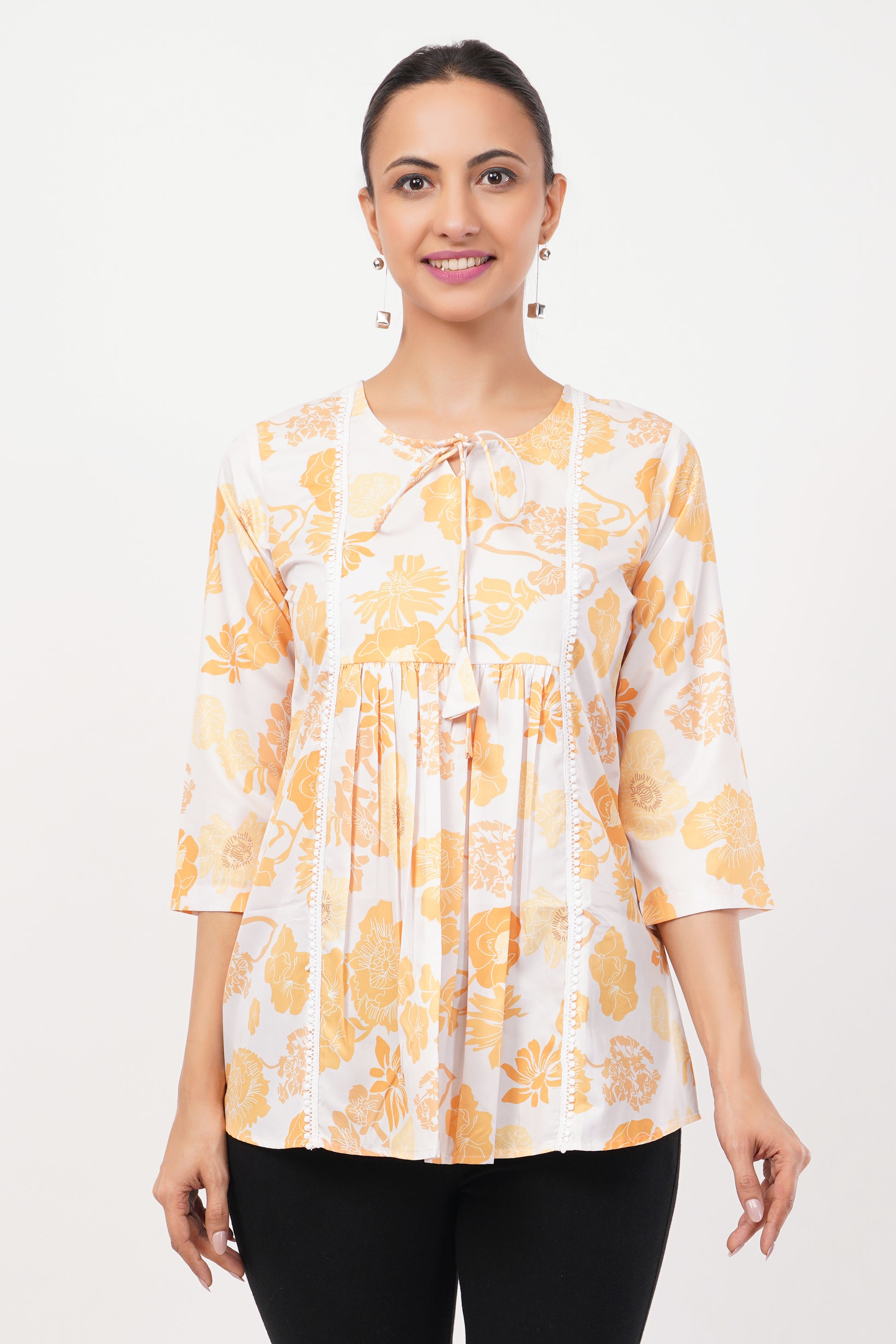 Refresh your wardrobe with the Strawberry Xpress White & Yellow Floral Crepe Tunic Top, a perfect blend of elegance and everyday comfort. Crafted from lightweight, breathable crepe fabric, this tunic keeps you feeling fresh and stylish all day long. The round neckline and 3/4 sleeves offer a classic and flattering fit, while the vibrant yellow floral print adds a cheerful, feminine touch. Whether you're heading to the office, meeting friends, or enjoying a casual day out, this tunic top is your go-to choice for effortless fashion.